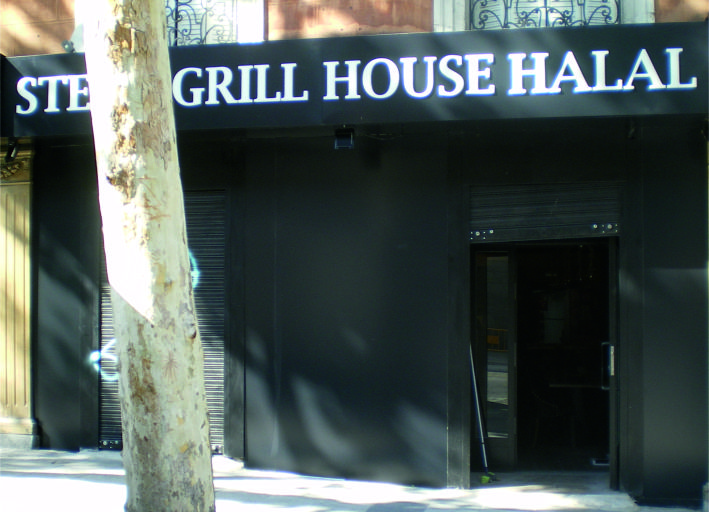 Chapa calada con letras de metacrilato blancas de 20 mm. de grosor e iluminación interior, se puede laminar la fachada de aluminio, guardando la estética del rótulo.